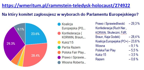 Były też i takie sondaże… internetowe, jak na załączonym obrazku. Internet to raczej domena młodych. Czyli drugi wynik – Konfederacji, nie był zaskoczeniem i gdyby tym klikającym w klawiaturę zechciałoby się ruszyć du….o, to dziś bylibyśmy już o wiele bliżej wyzwolenia. A tak wciąż tkwimy w Polsce reżimów partyjnych. Po wyborach jak zwykle, zaczynają się ruchy odśrodkowe. Rozsypuje się koalicja PO. PSL mówi o łączeniu z Kukiz’15. Konfederacja przekształca się w twór profesjonalny (vide: partia Jakubiak – Liroy). Tylko PIS… wpada coraz bardziej w pychę (krok do upadku). Ta partia socjalistów rozzuchwaliła się do tego stopnia, że nawołuje o to, by Naród na jesień dał jej … konstytucyjną większość! Do tego chce wchłonąć – Kukiz’15 !